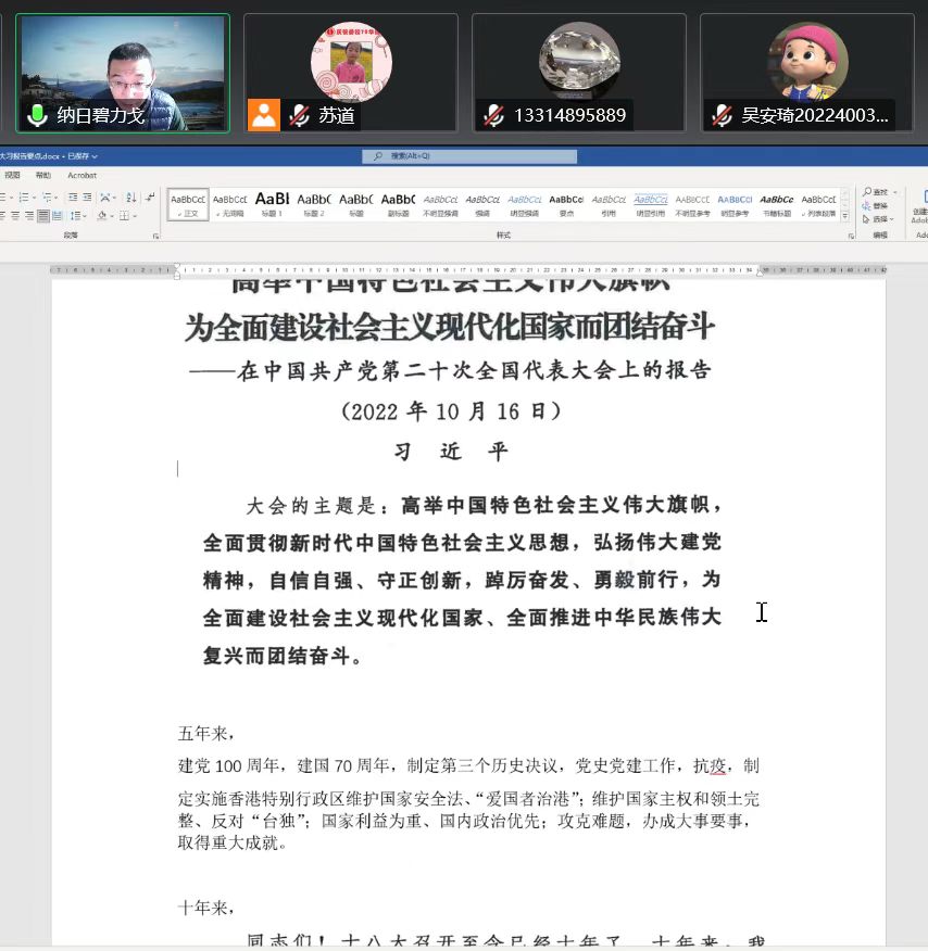 2022年11月1日上午,为了认真学习党的第二十次全国代表大会精神,全面、准确、完整领会习近平新时代中国特色社会主义思想,Beat365唯一官方网站铸牢中华民族共同体意识研究基地组织大家在线上研读党的二十大报告。基地首席专家纳日碧力戈教授主持研读会,基地副主任、院长乌日陶克套胡教授和部分教师以及硕士、博士研究生共20余人参加。