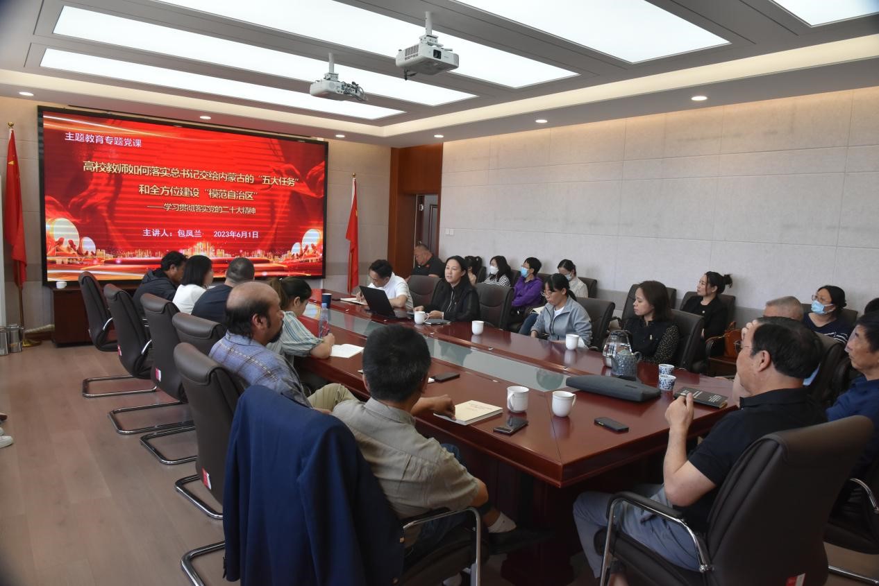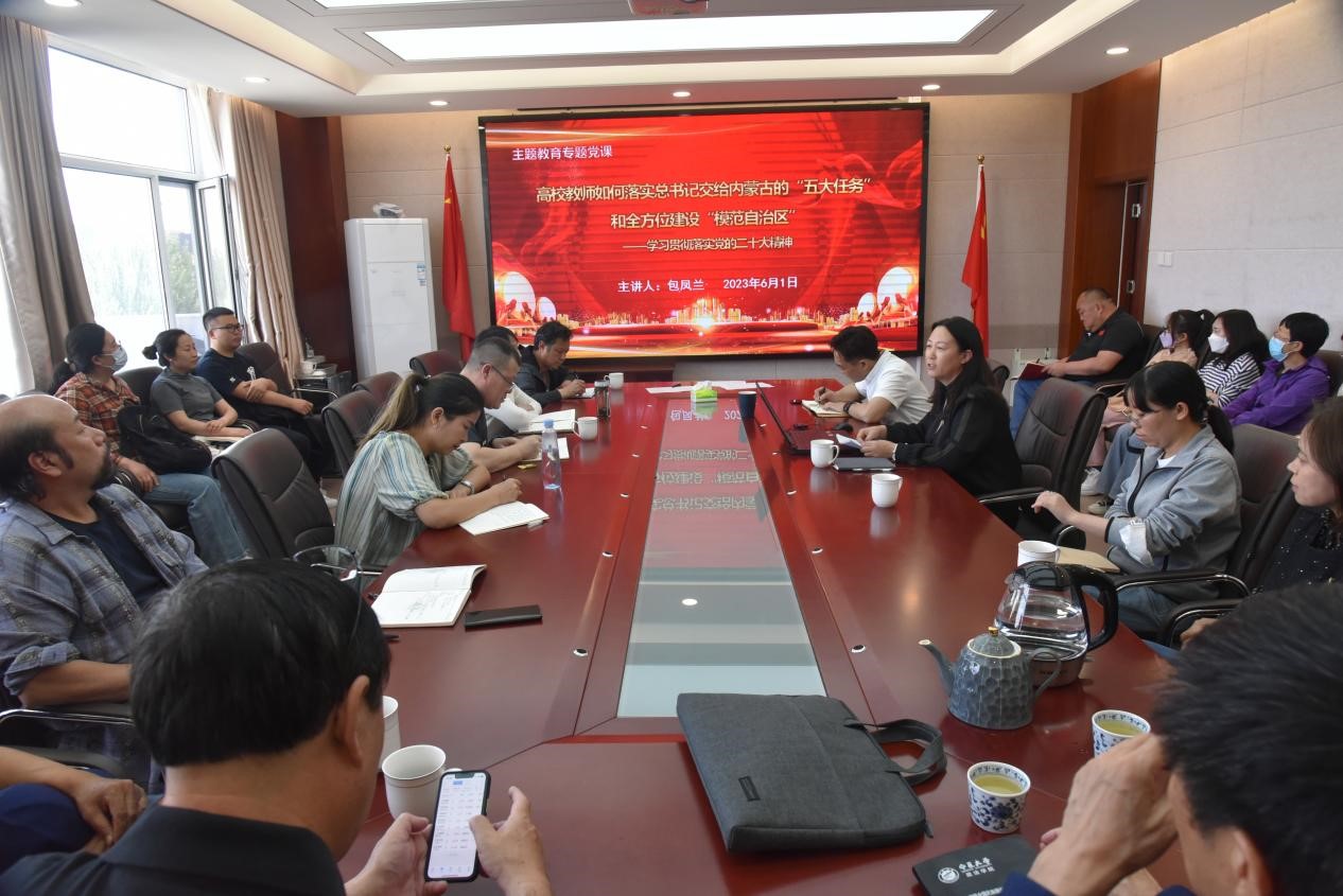 6月1日下午,Beat365官网党委书记包凤兰在田楼607会议室为学院教工做“高校教师如何落实总书记交给内蒙古的‘五大任务’和全方位建设‘模范自治区’”的主题教育专题党课。会议由党委委员、副院长满达主持。