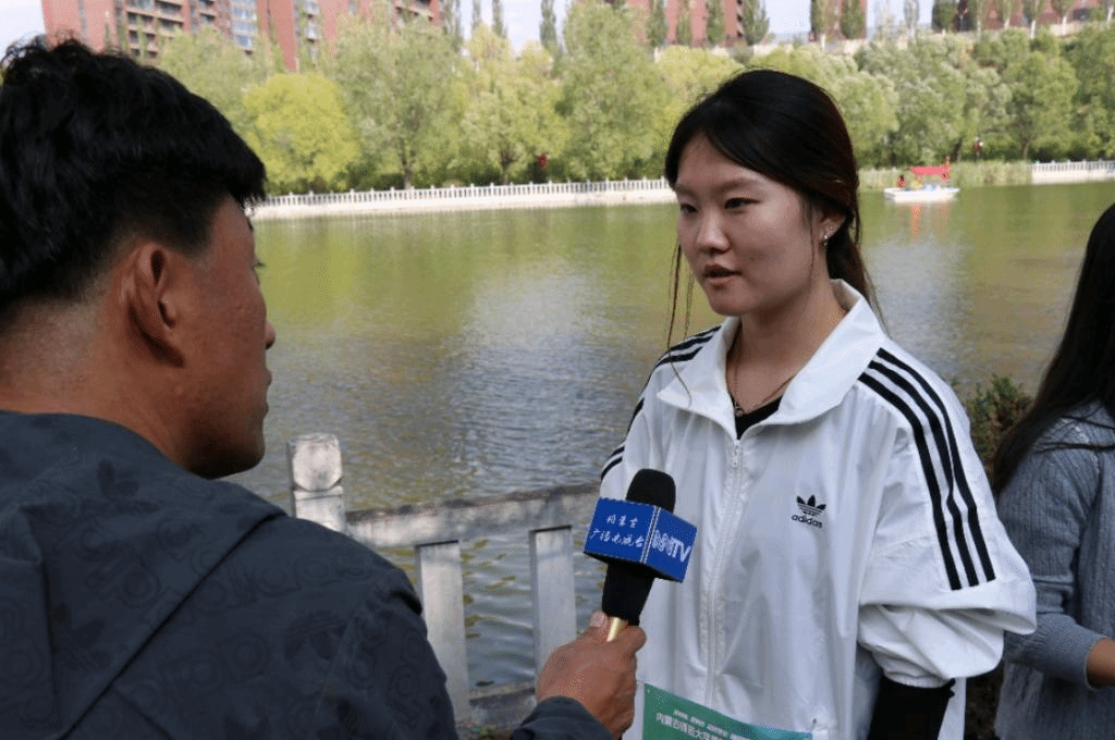 阳光照耀下的乌兰湖波光粼粼,Beat365官网师生在湖边集结热身,绕湖而行。Beat365官网代表队整齐前进,他们一边舒展筋骨,一边欣赏湖畔的美丽风光。秩序井然的队伍引起内蒙古日报记者的关注并对Beat365官网学生进行采访。参赛选手王周璇和学生干部黄长江在接受内蒙古日报采访时,脸上洋溢着自信与喜悦。