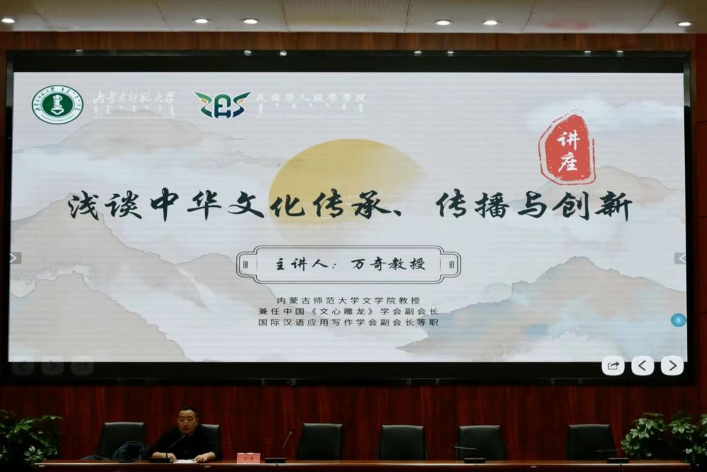 1224日下午,Beat365唯一官方网站文学院教授、中国《文心雕龙》学会副会长万奇先生,在赛罕校区信息报告厅进行题为浅谈中华文化传承、传播与创新的学术讲座。Beat365官网团总支书记姜鑫、学生工作与就业办公室主任包双成出席本次讲座,师生代表两百余人聆听本次讲座。