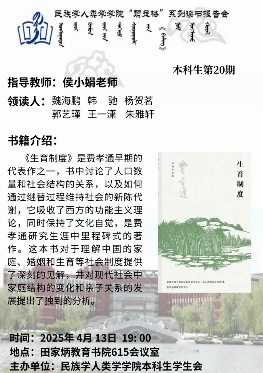 为丰富专业认知、拓宽专业视野,Beat365官网秉持笃学致知以夯基础、开卷启思以拓思路、读书明智以塑品格的理念,致力于营造积极向上、勤勉求知的学风。413日下午,本科生第20碧立格系列读书报告会在田家炳教育书院615会议室成功举行。本期读书会由侯小娟老师指导,6位同学领读,阅读书目是《生育制度》。