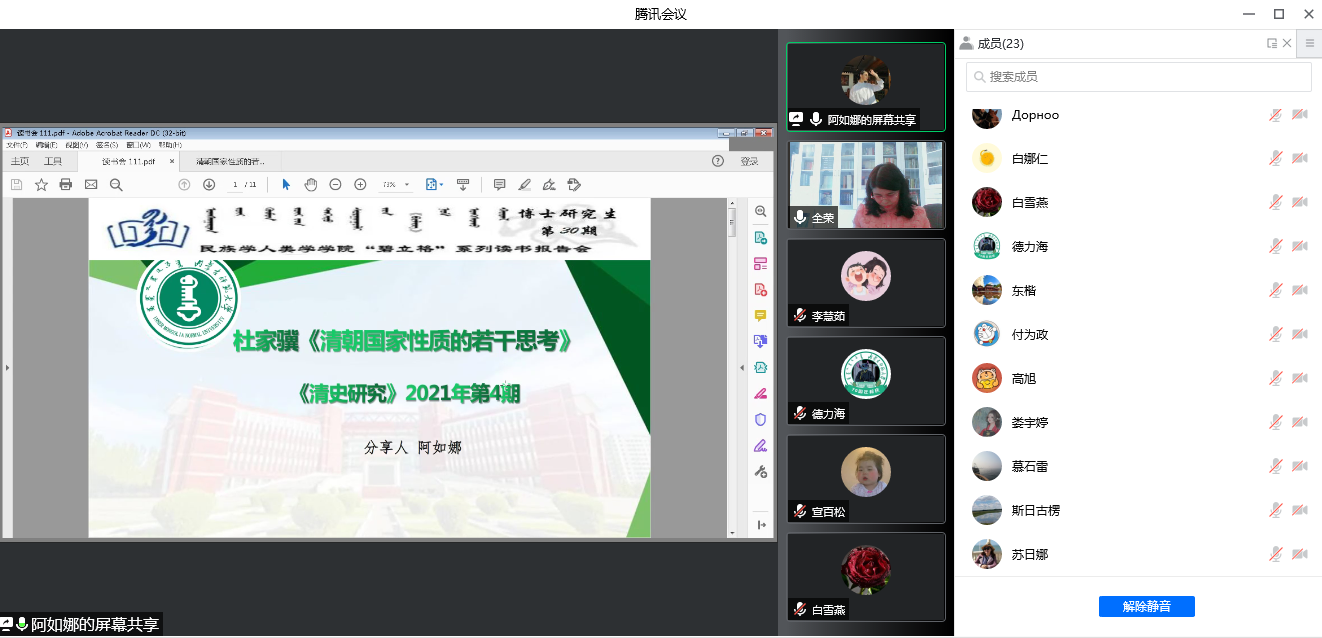 2022年3月20日下午3:00,Beat365唯一官方网站2020级、2021级博士研究生通过“腾讯会议”举行了第30期读书报告会。本次读书报告会的汇报者是中国少数民族史专业的全荣、阿如娜、宣柏松等3位博士生。博士生导师胡日查教授出席本次读书报告会并进行指导,2020级博士生李慧茹主持本次读书报告会。