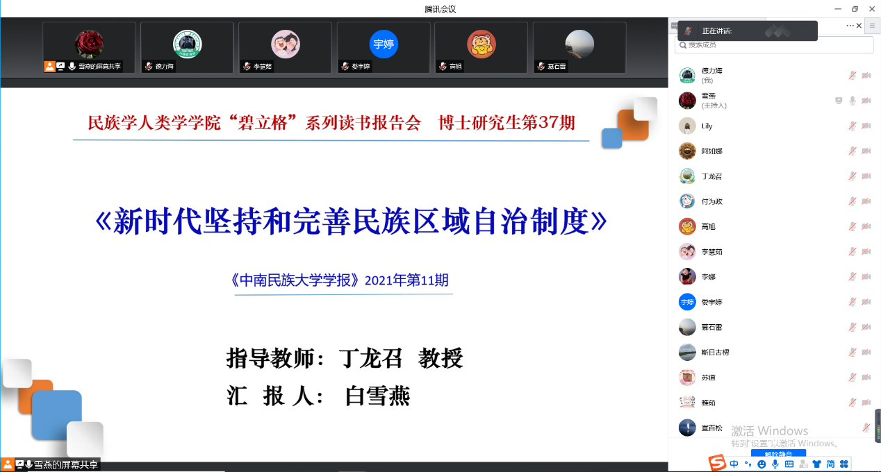 2022年5月8日下午3:00,Beat365唯一官方网站2020级、2021级博士研究生通过“腾讯会议”举行了第37期读书报告会。本次读书报告会的汇报者是2020级马克思主义民族理论与政策专业李慧茹、2021级马克思主义民族理论与政策专业白雪燕两位博士生。博士生导师丁龙召教授出席本次读书报告会并进行指导。