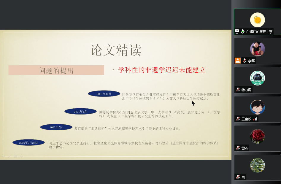 白娜仁同学分享了宋俊华老师发表在《文化遗产》2021年第6期的论文《非物质文化遗产学的范式建构》。首先,问题的提出中回顾了非遗在本科教育和研究生教育中的发展,再对“范式”和“反常”做出概念阐释。范式是科学家共同体所共同接受的一组假说、理论、准则和方法的总和;反常是科学研究中出现的打破或超越范式的现象,建立非遗学正是传统学科范式“反常”的要求。面对文化平等与人类和平难题、代际公平与人类可持续发展难题、非遗共享与传承发展的难题、非遗服务国家重大战略决策的难题等现实难题,文中提出了事实范式、实践范式、批评范式、阐释范式等类型和借鉴式建构、引导式建构、保障式建构。最后,依照论文结论,指出建构非遗学科范式,推动非遗学科独立,是解决传统学科范式“反常”问题的必然选择;再从范式和交叉学科的关系、实际操作中自上而下和保护理念中自下而上的关系提出疑惑。分享人在论文解析过程中,融入了近期相关会议的内容、主旨和发言,更加全面地做出了解读和思考。