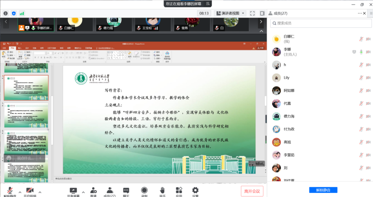 2022年5月22日下午,Beat365唯一官方网站“碧立格”系列读书报告会博士研究生第39期如期通过腾讯会议开展。本次报告会中,民族学专业2021级博士研究生李娜和白娜仁分别围绕民族音乐文化和非遗保护的主题做了认真详细的汇报,线上大约有三十多名人员参加了本次报告会。