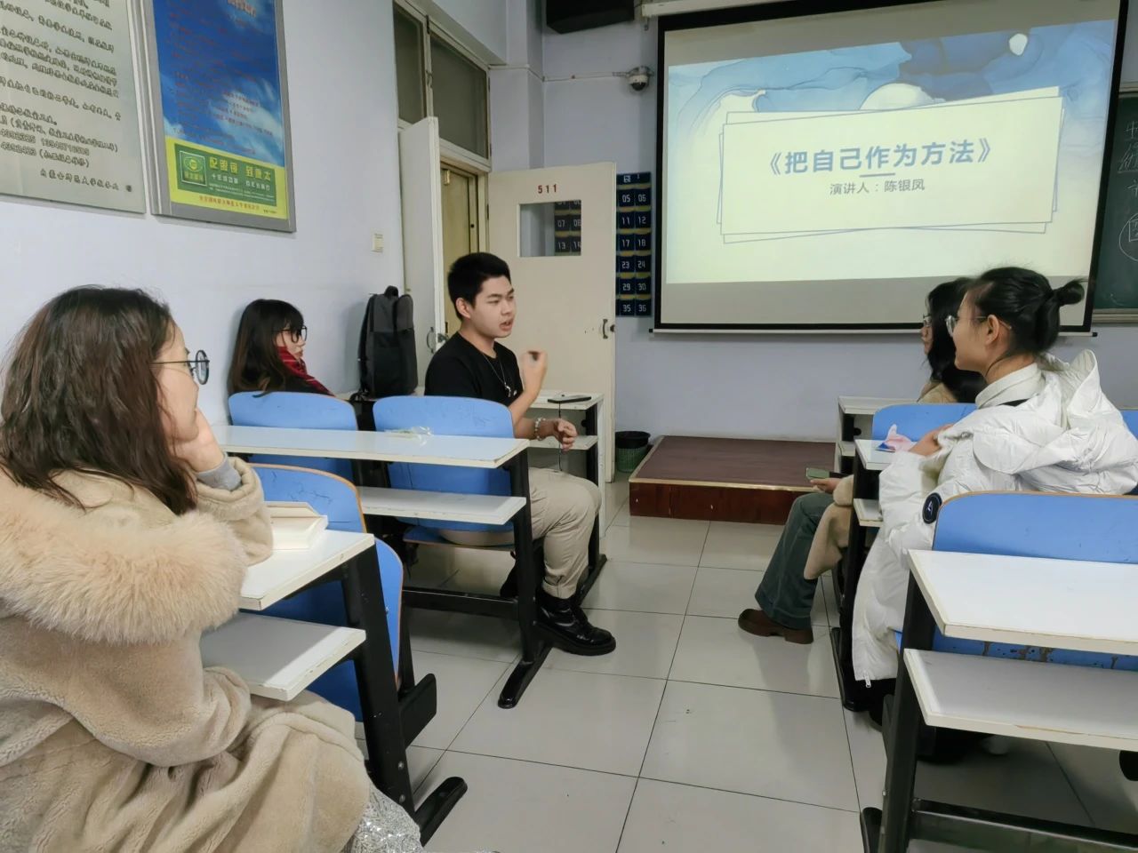 在刘燕飞老师的带领下,8位领读者以声情并茂、极具感染力的介绍,引领大家沉浸在书的世界,共享了一场丰富的精神盛宴,并且对此书进行了激烈的讨论,以及思想观点的交流与碰撞。此外,在本次读书会上,一些同学将昨天《中国式现代化、中华民族现代文明与人类文明新形态——基于文明形态学的分析》专题讲座中的知识与自己的感悟相结合,深入浅出地阐述了中心边缘理论。他们的分享让大家受益匪浅,领悟到了知识的真谛。