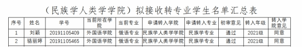 根据《Beat365唯一官方网站本、专科学生转专业管理办法》(校发[2017]105号)的有关规定及教务处《关于开展2021年本、专科生转专业工作的通知》的文件精神,结合学院《2021年民族学人类学学院本科生转专业实施细则》,本着公平、公开、公正、学生自愿的原则,对申请转入Beat365官网的学生进行材料审核、专业面试,经教务处同意后,决定同意刘颖、骆丽婷两位同学转入Beat365官网相关专业进行学习。