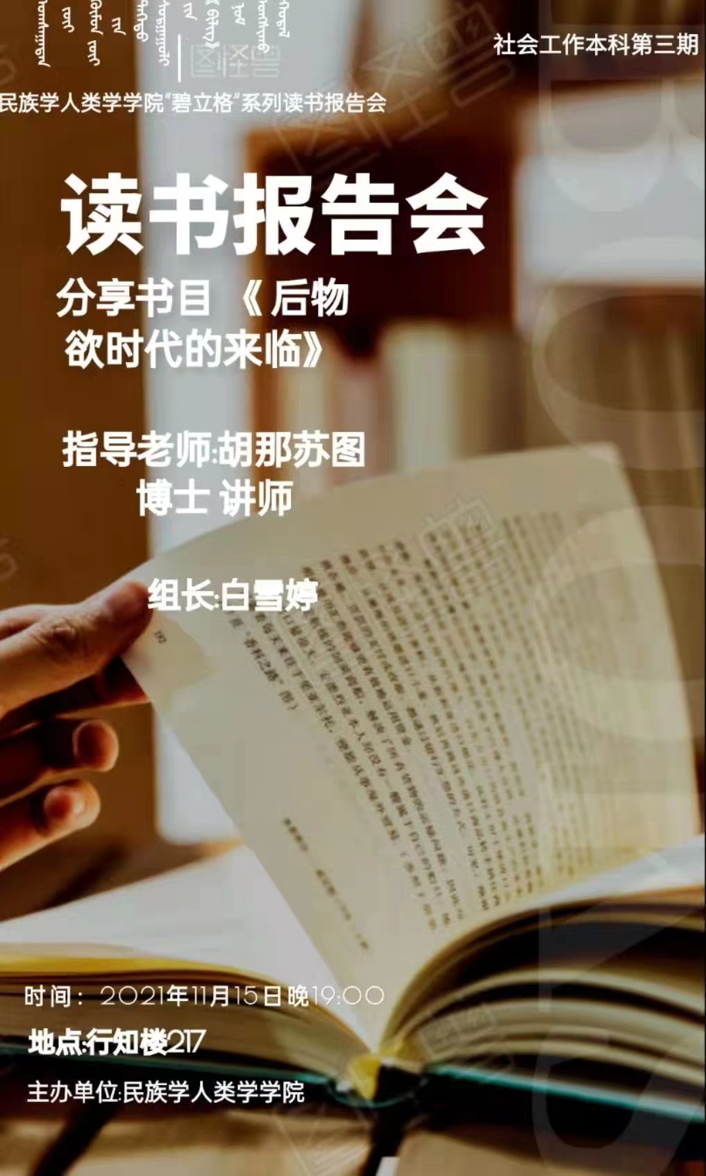 “碧立格”系列读书会2021级社会工作本科汉班第1期预告