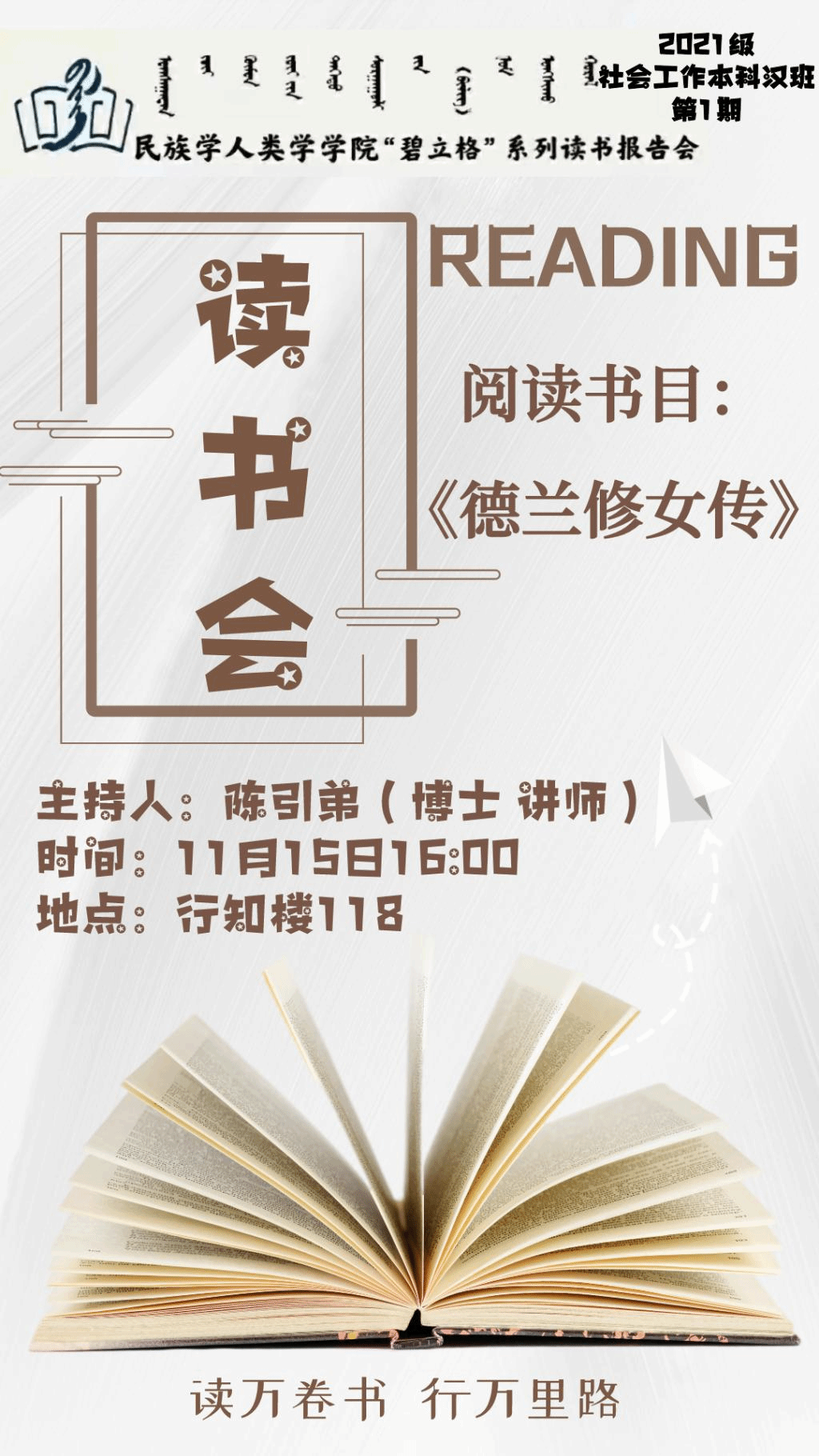 “碧立格”系列读书会2021级社会工作本科汉班第1期预告