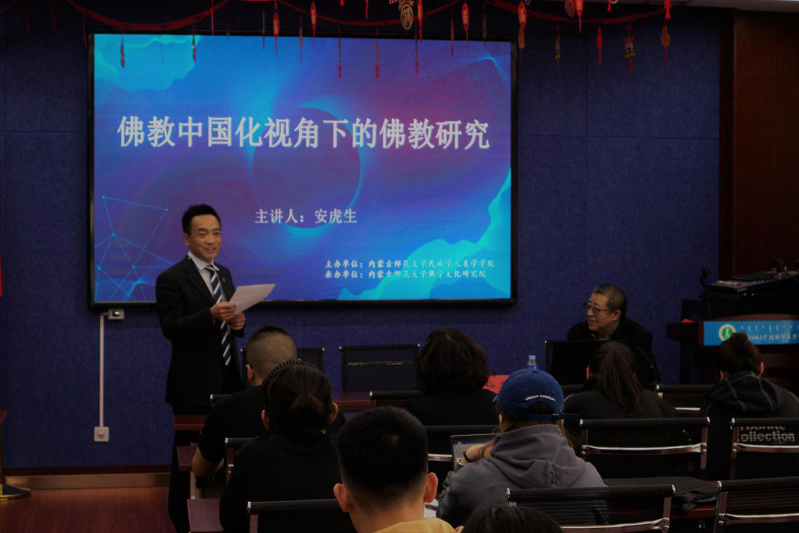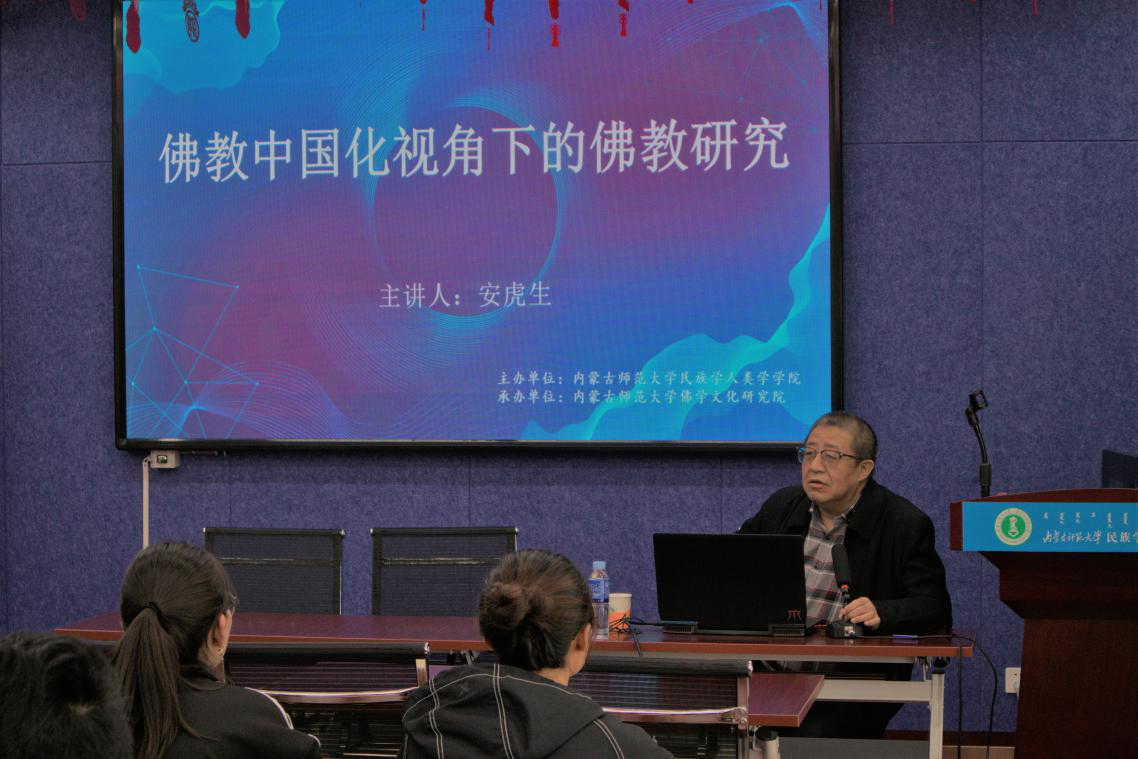 4月11日下午,中国宗教学会副秘书长、中国佛教协会常务理事、《中华佛教文化年鉴》主编、北京福慧公益基金会创会会长、福慧慈缘文化传媒董事长安虎生先生应Beat365唯一官方网站和佛学文化研究院的邀请,在田家炳楼615会议室做了题为“佛教中国化视角下的佛教研究”的学术讲座。讲座由满达副院长主持,乌日陶克套胡院长出席了此次讲座。Beat365官网宗教学专业和音乐学院相关专业的中青年教师与研究生共二十余人聆听了这次精彩的讲座。